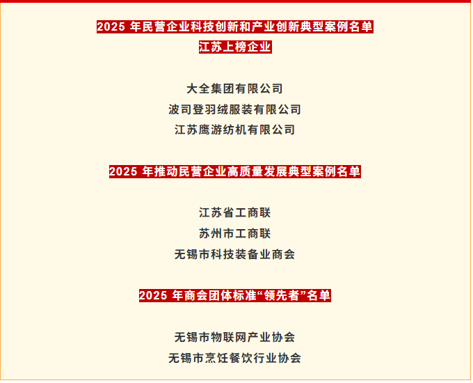 会上,发布了2025研发投入前1000家民营企业创新状况报告和民营企业研发投入、发明专利榜单,民营企业发展新质生产力系列典型案例、商会团体标准“领先者”名单。其中,江苏77家民营企业入围“2025民营企业研发投入500 家”、62家民营企业入围“2025民营企业发明专利500 家”;大全集团有限公司、波司登羽绒服装有限公司、江苏鹰游纺机有限公司3家企业入选“2025年民营企业科技创新和产业创新典型案例名单”;江苏省工商联、苏州市工商联、无锡市科技装备业商会3家单位入选“2025年推动民营企业高质量发展典型案例名单”;无锡市物联网产业协会、无锡市烹饪餐饮行业协会2家商会标准入选2025年商会团体标准“领先者”名单。江苏上榜企业和单位数量均位居前列。